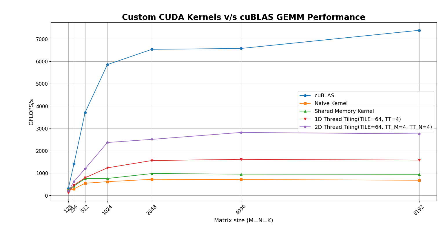 - As observed in the benchmark, 2D thread tiling yields the highest performance, achieving roughly 40% of the throughput of cuBLAS.